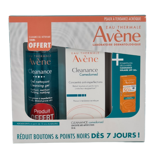 Avéne comedomed : c'est un soin unique qui réduit les boutons et points noirs existants et limite l'apparition de nouvelles imperfections grâce à son effet comedo-reverse anti-boutons et anti-récidive.+ cleanance gel nett 100ml qui elimine en douceur les impuretés de la peau. Visage et corps.