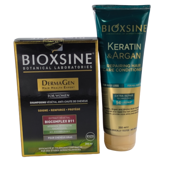 Le shampooing BIOXINE Femina à base de plantes est spécialement formulé pour les femmes présentant une chute de cheveux ou souhaitant préserver la santé de leurs cheveux + Après-shampooing nourrit, répare et hydrate les cheveux abîmés qui ont perdu leur brillance et leur hydratation grâce à sa kératine hydrolysée et son huile d’argan.
