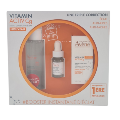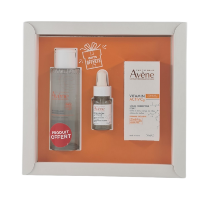 Pack soin anti-âge et éclat comprenant le Sérum Avène Vitamin Cg (30ml), l’Eau Micellaire (100ml) et un Sérum activ B3 (10ml) offerts. Ce trio lutte contre les rides, repulpe la peau et ravive l’éclat, tout en nettoyant et hydratant votre peau en profondeu