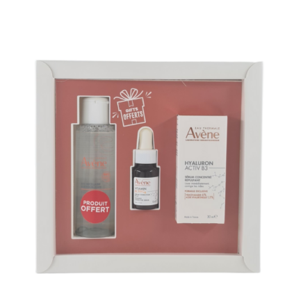 Pack soin anti-âge et éclat comprenant le Sérum Avène Hyaluron Activ B3 (30ml), l’Eau Micellaire (100ml) et un Sérum Vitamin Cg (10ml) offerts. Ce trio lutte contre les rides, repulpe la peau et ravive l’éclat, tout en nettoyant et hydratant votre peau en profondeu