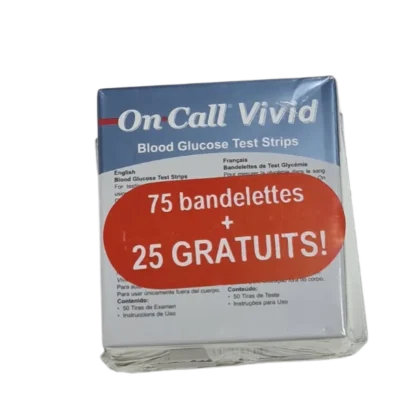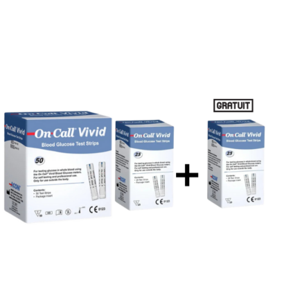 ON CALL VIVID : Pack exclusif de 75 bandelettes de test pour un suivi précis et fiable de la glycémie, avec 25 bandelettes gratuites. Idéal pour un contrôle régulier.