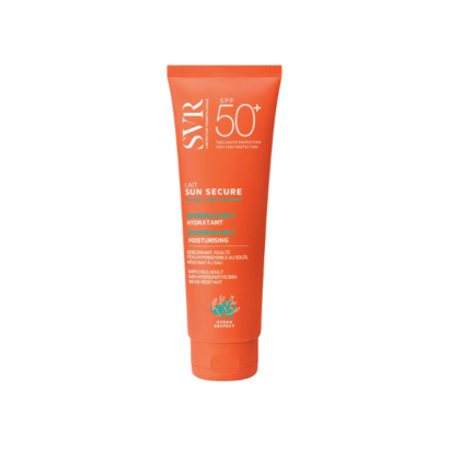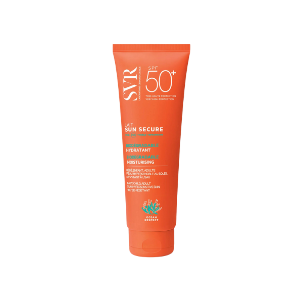 - Sun Secure Lait Corps SPF50+ (250ml) : lait fluide et velouté, sans parfum, adapté aux enfants et adultes. Très haute protection dermatologique, fini invisible et non gras.
