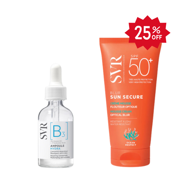 Le pack SVR Ampoule Hydra B3 & Sun Secure Blur SPF50+ combine hydratation intense, apaisement et haute protection solaire. L’ampoule enrichie en vitamine B3 et acides hyaluroniques hydrate, repulpe et réduit les inconforts. Le Sun Secure Blur SPF50+ protège des UV tout en floutant les imperfections pour un teint unifié et lissé. Un duo parfait pour une peau nourrie, protégée et visiblement plus jeune.