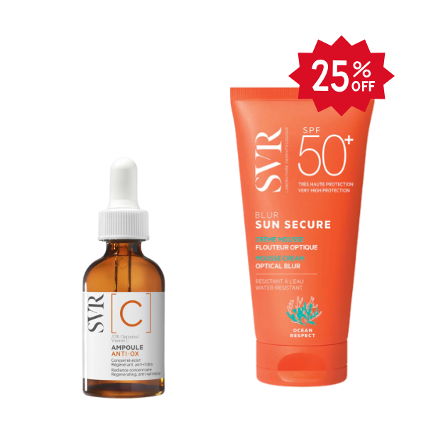 SVR Ampoule Anti Ox, un sérum ultra-concentré en vitamine C pour une peau lumineuse et tonifiée, associé à SUN SECURE Blur SPF50+, une crème solaire à la texture mousse floutante pour une protection invisible et un teint lissé.
