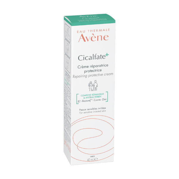Cicalfate+ Crème Réparatrice Protectrice (40ml) : Cette crème est formulée pour apaiser, protéger et favoriser la réparation des peaux irritées. Elle forme un film protecteur sur les zones abîmées, créant un effet « pansement » qui protège l’épiderme. Grâce à l’Eau thermale d’Avène, au complexe réparateur [C⁺-Restore]™, et aux ingrédients purifiants comme le sulfate de cuivre et le sulfate de zinc, cette crème est idéale pour toute la famille et peut être utilisée sur les zones intimes externes.